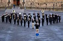 The marching band and the ceremonial band are the flagship units of the NAVEUR Band, supporting military ceremonies by leading the formation in parades and rendering honors (the former is done by the marching band).[7][8]