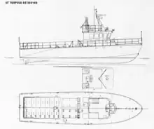 These vessels were built by Sewart Seacraft.[41] They were a derivative of an oilfield services crew boat which Sewart sold to support offshore oil installations in the Gulf of Mexico.[42] They were constructed of welded aluminum plates. They were 85 feet (26 m) long, with a beam of 18.7 feet (5.7 m), and a draft of 5.67 feet (1.73 m). They displaced 61 tons at full load. They could reach a speed of 21 knots. They had two propellers driven by two General Motors 16V-71 Diesel engines that produced 1,160 horsepower.[16] They had deck space to recover as many as eight torpedoes. These boats sailed with a crew of five men.[7] Although their hull registration numbers remained in the torpedo retriever sequence, they were referred to as "weapon retriever boats" at the Pacific Missile Range Facility where two were based.
