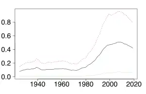 Crime rates in low-income areas are much higher than in middle to high class areas. As a result, incarceration rates in low-income areas are much higher than in wealthier areas due to these high crime rates.[44] When the incarcerated or criminal is a youth, there is a significant impact on the individual and rippling effects on entire communities. Social capital is lost when an individual is incarcerated. How much social capital is lost is hard to accurately estimate, however Aizer and Doyle found a strong positive correlation between lower income as an adult if an individual is incarcerated in their youth in comparison to those who are not incarcerated.[45] 63 percent to 66 percent of those involved in crimes are under the age of thirty.[44] People incarcerated at a younger age lose the capability to invest in themselves and in their communities. Their children and families become susceptible to financial burden preventing them from escaping low-income communities. This contributes to the recurring cycle of poverty that is positively correlated with incarceration.[46] Poverty rates have not been curbed despite steady economic growth. Poverty is not the sole dependent variable for increasing incarceration rates. Incarceration leads to more incarceration by putting families and communities at a dynamic social disadvantage.[47]