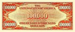 The United States one hundred thousand dollar bill (US$100,000) is a former denomination of United States currency, a gold certificate, issued for two years from 1934 to 1935 as designated for Federal Reserve use. The bill never circulated publicly, rather having been used as a large denomination note for gold transactions between Federal Reserve Banks.[2][3] Featuring President Woodrow Wilson, the $100,000 bill was initiated by the Bureau of Engraving and Printing under the order of President Franklin D. Roosevelt in response to the hoarding of gold during the Great Depression, believed to be slowing economic regrowth. Executive Order 6102, signed by President Roosevelt, was ratified by the United States Congress in 1934. Executive Order 6102 prohibited the hoarding of gold certificates, accompanied also by bullion and coins.[4]