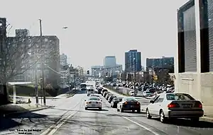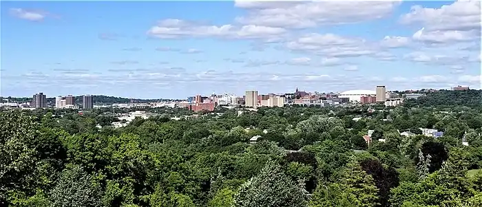 University Hill is a neighborhood and business district in Syracuse, New York, located east and southeast of Downtown Syracuse, on one of the larger hills in Syracuse. The neighborhood is bounded on the west by Almond Street and Interstate 81.[2] It continues east to Ostrom Avenue and Thornden Park, where it borders the Westcott and University neighborhoods. Interstate 690 currently serves as the neighborhood's northern boundary.[2]