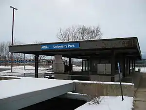 University Park is a station on Metra's Metra Electric District line located in University Park, Illinois. University Park is the southern terminus of the Metra Electric main line and is 31.5 miles (50.7 km) away from the northern terminus at Millennium Station.[1] The station is located on South Governor's Highway near West Stuenkel Road. In Metra's zone-based fare system, University Park is in zone G. As of 2018, University Park is the 64th busiest of Metra's 236 non-downtown stations, with an average of 808 weekday boardings.[2]