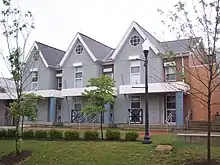 The Ghetto also contains several high-density living areas, including the Garden Apartments, the Lawnview Apartments and the Campus South, a high-rise living complex for sophomores. In 2004, the ArtStreet complex opened, intended as a combined living-learning space. It includes housing for 56 students, as well as a cafe, an amphitheater, rehearsal rooms, several activity rooms and gallery spaces, and a new studio for the campus radio station, WUDR.[16] The Ghetto was also home to the McGinnis school house, which was acquired in 1982 and renamed the McGinnis Center; it is used as a central point of contact for residents.[3] In 2017 McGinnis Center was demolished to make room for the addition of an $11 million apartment style building.[17] The building is set to open for the 2018 Fall semester.