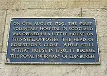 The Edinburgh Royal Infirmary began operating from a small house—leased from the University of Edinburgh[12]—which was located opposite the head of Robertson's Close, in today's Infirmary Street. Resident staff included a matron, one domestic servant, and volunteer physicians and surgeons who attended in fortnightly rotations.[12] Only four beds were available from 6 August 1729 and medical students' visits were limited to two tickets only per student (to prevent crowding).