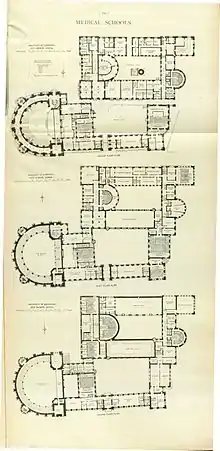 The competition to design the University's new buildings was won by the architect Sir Robert Rowand Anderson in 1877 (who later designed the dome of the Robert Adam/William Henry Playfair Old College building). After extensive European travel, he decided upon a 'Cinquecento' Italian Renaissance style which he judged "more suitable than Greek or Palladian, where the interior would have been constrained by the formal exterior, or mediaeval, which would have been out of keeping with the spirit of scientific medical enquiry". Initially the design incorporated a new University Graduation Hall, but as this was seen as too ambitious. A separate building was constructed for the purpose, the McEwan Hall, also designed by Anderson, after funds were made available by the brewer Sir William McEwan in 1894. The final grand structure took three years to decorate including elaborate ceiling murals and organ.
