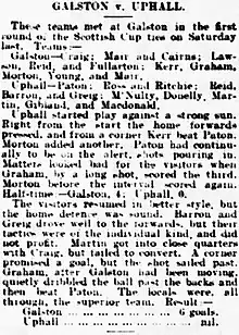 By beating Aberdeen University 3–0 in the third round, Uphall guaranteed entry into the Scottish Cup proper; despite the importance of the match there was only a "small attendance".[9] The club's Qualifying Cup run ended at Dumfries F.C. in the next round,[10] and in the first round proper the club was unlucky to be drawn at Galston F.C. rather than a Scottish League club. The club went down to a 6–0 defeat.