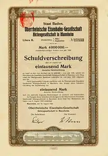 Debenture with a face value of 1000 marks of the Upper Rhine Railway Company AG issued on 10 August 1920