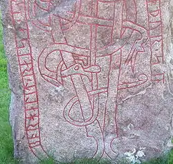 This runestone, which is 1.95 meters in height, consists of runic text in the younger futhark carved on an intertwined serpent. It was discovered in 1866 located within the foundation walls of the Uppsala Cathedral. Many runestones were used in the construction of buildings, roads, and bridges before their historical importance was understood. The inscription consists of runic text within a serpent band that circles other intertwined serpents. The inscription is attributed to the runemaster Öpir[1] and is classified as being carved in runestone style Pr5, which is also known as Urnes style. This runestone style is characterized by slim and stylized animals that are interwoven into tight patterns. The animal heads are typically seen in profile with slender almond-shaped eyes and upwardly curled appendages on the noses and the necks.