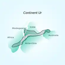 Important geological similarities link now remote Archaean cratons in India (Singhbhum and Dharwar), western Australia (Kilbaran and Pilbara), and southern Africa (Kaapvaal and Zimbabwe) which indicate that these protolithic shields were close together in the Mid-Archaean. The name "Ur", from the German prefix ur- meaning "original", was introduced by Rogers 1993, since it is the first continent in his tectonic reconstructions.[6] Other Archaean continental assemblages are considerably younger: Arctica (Baltica, Laurentia, Ur, and Siberia) consolidated around 2.565 Gya, Atlantica (West Africa and eastern South America) consolidated around 2.11 Gya. In some reconstructions the shields of Ur stayed near each other until the Mesozoic break-up of Gondwana.[7]