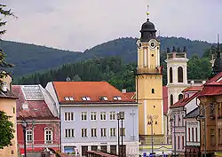 Urpín's two summits (Urpín and Vartovka) behind Banská Bystrica's clock tower