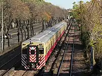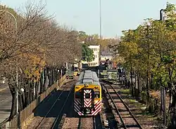 The Urquiza Line is a 26 km (16 mi) suburban electric commuter rail line in Buenos Aires, Argentina, operated by the former Buenos Aires Underground operator Metrovías.[2] It runs from the Federico Lacroze terminus in the neighborhood of Chacarita, to General Lemos terminus in Campo de Mayo district of Greater Buenos Aires, completing a total journey time of 46 minutes. The line uses third rail current collection and, at present, is used by an average of 75,400 passengers daily.[3] The line operates 20 hours a day, 7 days a week at 8 to 30 minute intervals. This suburban line runs on track once operated by General Urquiza Railway before railway privatisation.