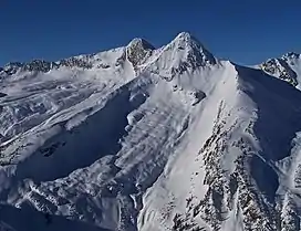 Ursus Major Mountain is a 2,705-metre (8,875-foot) mountain summit located in Glacier National Park, in the Hermit Range of the Selkirk Mountains in British Columbia, Canada. Ursus Major Mountain is situated 5.5 km (3.4 mi) west of Rogers Pass, 52 km (32 mi) northeast of Revelstoke, and 44 km (27 mi) west of Golden. Its nearest higher peaks are Catamount Peak, 1.8 km (1.1 mi) to the southwest, and Ursus Minor Mountain, 2.24 km (1.39 mi) to the northeast.[3] The first ascent of the mountain was made August 5, 1902, by a Dominion Topographic Survey party.[1] The mountain's name was adopted in 1906, then re-approved September 8, 1932, by the Geographical Names Board of Canada.[2] It was so-named by the survey party because of its proximity above Bear Creek (since renamed Connaught Creek), and in keeping with the bear theme of other nearby features such as Ursus Minor Mountain, Grizzly Mountain, Bruins Pass, and Balu Pass.[4] The high point on Ursus Major's east ridge is unofficially called Balu Peak.