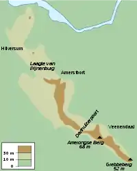 On the southeastern side the ridge rises sharply from the valley of the Nederrijn (Lower Rhine). Here the famous Grebbeberg (Grebbe Mountain) forms a landmark (52 m. high) where the Battle of the Grebbeberg took place in 1940 as an important part of Battle of the Netherlands. The highest peak of the ridge is the Amerongse Berg (Amerongen Mountain) of 68 m. On the northern side the ridge continues to the shores of the Gooimeer (Lake Gooi).