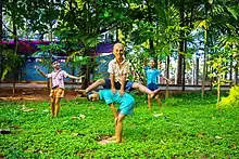 Small children with different poses are shown. One child is seeing towards sky and praying the god, other child signifies the famous quote - see no evil, hear no evil, speak no evil. The tree with sprinkling water, a place is given for birds shows the policy of live and let live.