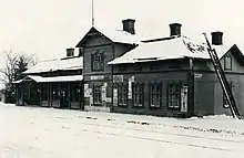 Its original Class III station building was built according to plans from Knut Nylander, and was completed in 1869. The premises of the station also included a freight warehouse, outhouse, guard's cabin as well as a water tower for maintenance of steam locomotives. The station building was completely destroyed by the fire bombings in March 1940, and was replaced by a new one later in the same year. It is representative of the simple architectural principles of stations from the wartime era with its rectangular shape. A small warehouse is directly connected to the main station building via one of its walls. Save for this warehouse, the building originally had a light plasterwork on its outer surface, but it was later entirely covered with painted wooden boards.[4]