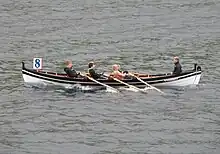 Rowing competition at Jóansøka in Vágur in June 2010. Royndin Fríða is the white and black boat. They won this competition.[2]
