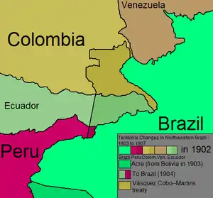 The Vásquez Cobo–Martins treaty, also known as Treaty of Bogotá, was a treaty between Brazil and Colombia denoting the Brazil–Colombia border; It was signed in Bogotá by their respective representatives, the Minister of Foreign Affairs of Colombia, Alfredo Vásquez Cobo, and the Resident Minister on Special Mission to Colombia, Enéas Martins. It was ratified by Colombia by means of Law 97 of 1907 and the Exchange of Ratifications took place on 20 April 1908 in Rio de Janeiro.[1] The treaty established the border from the Rio Negro northwestward along the Amazon River-Orinoco watershed divide, "then generally southward along various river courses and straight-line segments to the mouth of the Apaporis River"[2]
