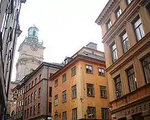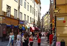 Västerlånggatan ("the Western Long Street") is a street in Gamla stan, the old town of Stockholm, Sweden. Stretching southward between the squares Mynttorget and Järntorget, it follows the course of the city's now demolished 13th-century defensive wall.