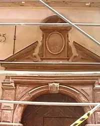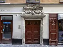 Number 52 was called Sidenhuset Pärlan ("silk house the Pearl") and the portal still features the pear-shaped pearl over the front door which was the owner's mark of the silk trader Henric Meurman. He created a small-ware shop in the 1660s, decorating the portal with fruit garlands and a bow resembling those on the House of Knights, following a common practice for burghers to copy decorations found on prominent palaces.[18]