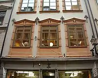 Above street level and behind the intact front, Number 7–17 are the semi-detached offices of the Riksdag. On number 7 are Roman letters displaying the year 1888 when the Neo-Renaissance sgraffito façade was created. On number 13 above the windows on the first floor, are the heads of Victor Emanuel II, Garibaldi and Cavour, obviously added by someone favourably disposed towards the Italian unification.[6] The entire block is hiding the northern end of Prästgatan, one of the few blind ends of the old town, which was historically known as Helvetesgränd ("Alley of Hell"), either because the city executioner resided in the area or because the entire neighbourhood is located north of the cathedral (e.g. in Norse folklore associated with the "Kingdom of the Dead").[7]