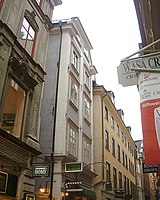 The café Gråmunken on Number 18 is a well-established café, since several generations renowned for the medieval vaults in the basement. While a gravel ridge composes most of the soil in the surrounding area, the block behind the café is built on solid rock located above sea level during the Viking Age, and hopefully future excavations will be able to further document the earliest history of the area.[10] Archaeological excavations in the street just outside Number 18 have unveiled several layers of earlier street levels, with traces of paved streets found a metre below the present pavement.[11] North of Number 18 is Stora Gråmunkegränd ("Great Grayfriars Alley"), which used to lead from the Greyfriars islet (Riddarholmen) to the defensive tower on the east side of Västerlånggatan. South of the café is Helga Lekamens Gränd ("Alley of the Holy Body [of Christ]"), named after an influential guild existent from the 15th century to the Reformation (1520s). Between these two alleys is a barred alley.