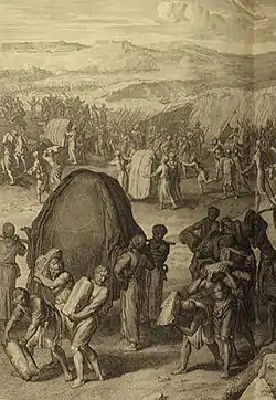 Rabbi Tarfon taught that God came from Mount Sinai (or others say Mount Seir) and was revealed to the children of Esau, as Deuteronomy 33:2 says, "The Lord came from Sinai, and rose from Seir to them," and "Seir" means the children of Esau, as Genesis 36:8 says, "And Esau dwelt in Mount Seir." God asked them whether they would accept the Torah, and they asked what was written in it. God answered that it included (in Exodus 20:13 and Deuteronomy 5:17, "You shall do no murder." The children of Esau replied that they were unable to abandon the blessing with which Isaac blessed Esau in Genesis 27:40, "By your sword shall you live." From there, God turned and was revealed to the children of Ishmael, as Deuteronomy 33:2 says, "He shined forth from Mount Paran," and "Paran" means the children of Ishmael, as Genesis 21:21 says of Ishmael, "And he dwelt in the wilderness of Paran." God asked them whether they would accept the Torah, and they asked what was written in it. God answered that it included (in Exodus 20:13 and Deuteronomy 5:17), "You shall not steal." The children of Ishamel replied that they were unable to abandon their fathers' custom, as Joseph said in Genesis 40:15 (referring to the Ishamelites' transaction reported in Genesis 37:28), "For indeed I was stolen away out of the land of the Hebrews." From there, God sent messengers to all the nations of the world asking them whether they would accept the Torah, and they asked what was written in it. God answered that it included (in Exodus 20:3) and Deuteronomy 5:7), "You shall have no other gods before me." They replied that they had no delight in the Torah, therefore let God give it to God's people, as Psalm 29:11 says, "The Lord will give strength [identified with the Torah] to His people; the Lord will bless His people with peace." From there, God returned and was revealed to the children of Israel, as Deuteronomy 33:2 says, "And he came from the ten thousands of holy ones," and the expression "ten thousands" means the children of Israel, as Numbers 10:36 says, "And when it rested, he said, 'Return, O Lord, to the ten thousands of the thousands of Israel.'" With God were thousands of chariots and 20,000 angels, and God's right hand held the Torah, as Deuteronomy 33:2 says, "At his right hand was a fiery law to them."[68]
