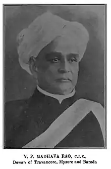 1. Eugene F. Irschick (1986). Tamil Revivalism in the 1930s. p. 271. V.P. Madhava Rao ( 1850-1934 ) a famous Maharashtrian Madhva Brahman, whose forebears settled in Tanjore and who was among other things successively Diwan of the princely states of Travancore, Mysore, and Baroda.