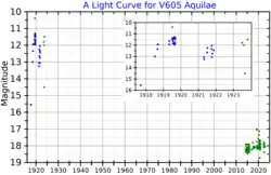 ![]() A light curve for V605 Aquilae, plotted with data from the AAVSO,[1] Duerbeck et al.[2] and Wolf.[3] The green points show the visual band data and the blue points show the photographic (blue band) data. The inset plot shows the period of peak brightness with an expanded scale. | |