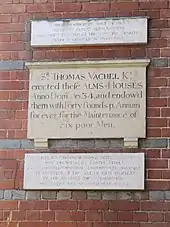 Sr. Thomas Vachel Kt. erected there Alms-Houses Anno Dom. 1634, and endow'd them with Forty Pounds p. Annum for ever for the Maintenance of Six Poor Men.[2]
