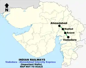 The 19035/36 Vadodara Ahmedabad Intercity Express runs from Vadodara Junction via Bajva, Anand Junction, Nadiad Junction, Maninagar to Ahmedabad Junction.