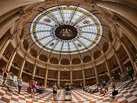 The Mercado Central (transl. Central Market) in Valencia, one of the largest in Europe, covers more than 8,000 square metres, over two floors, with a predominantly Valencian Art Nouveau style. Its unusual roof comprises original domes and sloping sections at different heights, while the interior seems to be lined in a range of materials such as iron, wood, ceramics and polychromed tiles. The beauty of the building stands out especially on account of the light that enters through the roof at various points, and through coloured window panels.[6]