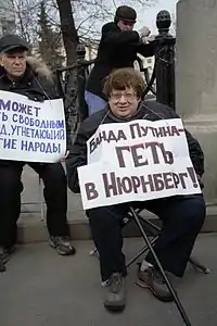 Novodvorskaya with a poster telling "Putin's gang, get out to Nuremberg!" Moscow, 2014