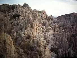 Valle de la Luna, also calling Killa Qhichwa (Moon Valley) is situated about 10 kilometers from downtown La Paz, in the Pedro Domingo Murillo Province, La Paz Department, Bolivia. It consists of an area where erosion has worn away the majority of a mountain, composed primarily of clay rather than rock, leaving tall spires. It is similar to another zone of La Paz that is known as El Valle de las Animas (The Valley of the Souls). It is an important site of the famous holiday, Dias de los Muertos (Day of the Dead).