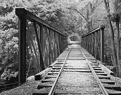 Built for the Northern Central Railroad in 1870, this 190-foot-long bridge was disassembled and reassembled on the Stewartstown Railroad in 1885. A girder structure was added in 1920, and the original bridge structure was removed, although the original 1870 trusses are still in place. The bridge is still in active use, and services the Stewartstown Railroad passenger excursions.[2]