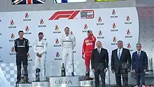 He won the 2017 Russian Grand Prix on 30 April 2017, his first Grand Prix win, after jumping the Ferraris of Sebastian Vettel and Kimi Räikkönen from 3rd on the grid on the first lap, making him the fifth Finn to win a Grand Prix.[44] He retired from 3rd in the next race in Spain with an engine issue, having previously survived a collision with Verstappen and Räikkönen on the first lap that took the other two drivers out of the race.[45] Mercedes was off the pace in Monaco, struggling to generate heat in the tyres. Nevertheless, Bottas qualified 3rd, less than a tenth of a second off the pole time, while his teammate, Lewis Hamilton, could only qualify 14th. Bottas finished 4th in the race.[46]