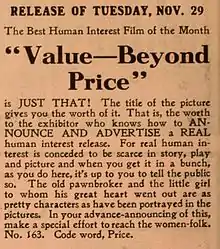Value—Beyond Price is a 1910 American silent short drama produced by the Thanhouser Company. The film focuses on a family beset by tragedy when the father is presumed dead after his ship is lost at sea. The mother struggles to support her child and sells her possessions to a pawnbroker. When she has nothing left, save her wedding ring, the pawnbroker asks to take care of the child and the mother consents. The pawn broker gives her a pawn ticket for the girl stating "a precious jewel, a value beyond price" and tells her she can redeem it at any time. Before her death, she entrusts the ticket to a friend. Ten years pass, the shipwrecked father has discovered a great fortune on the island and is rescued by a passing steamship. The father soon realizes his wife is dead and his child is missing, but he receives the pawn ticket and decides to claim this jewel his wife had left for him. He redeems it at the pawn shop and finds it is his lost daughter. The film was released on November 29, 1910 and it was met with positive reviews. The film survives in the Library of Congress archives.