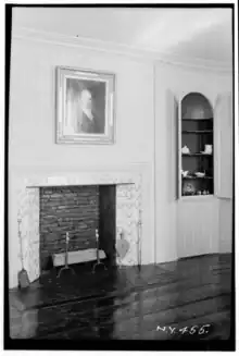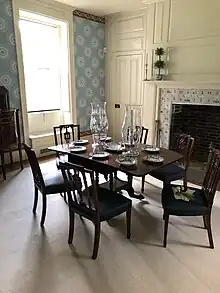 The dining room is in the eastern wing, separated from the eastern parlor by the rear hall,[190] and is designed in a late-18th-century style. It was likely not originally used for meals, as Americans generally did not have dedicated dining rooms prior to the American Revolution.[181] The dining room had a fireplace with a mantel from c. 1800,[171] which had ornamentation such as pilasters, sunbursts, and motifs of one-quarter of a fan.[181] There was a small closet built into the side of the fireplace mantel, which was used to keep items warm during winters. One corner of the room also featured a large white cupboard which was used to store porcelain.[191] The walls are made of light plaster above dark buff wainscoting, and a chimney occupies the north wall. Atop the wall was a ceiling molding, which likely dated from the 19th century.[181] An 18th-century ceiling molding and fireplace mantel were restored in a subsequent renovation.[192]