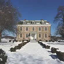 Frederick died before the house was finished, and he bequeathed the estate to his son, Jacobus (James) Van Cortlandt.[29][35][51] His bequest also included either 11 or 12 slaves who worked on the plantation.[52] Vault Hill, the Van Cortlandt family burial ground to the north of the mansion,[53][54] was created in 1749,[31] and Frederick was interred there.[55][54] After its completion, the Van Cortlandt House was often called the manor house, although this was a misnomer, as the "manor" name applied to the Van Cortlandt Manor in Croton-on-Hudson, New York.[56] The mansion was also called "Lower Cortlandt's" to reduce confusion with Frederick Van Cortlandt's farm, "Upper Cortlandt's", west of Broadway.[57]