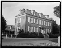 The house, designed by an unknown architect,[170] is built in the Georgian style and is 2+1⁄2 stories tall.[171][172] It was reportedly based off Philipse Manor in Westchester County.[60][100][173] The house has an L-shaped plan, with wings extending along the south and east sides.[158][171] The southern wing was probably completed first, followed by the eastern wing.[158] A lean-to was added to the house in the 19th century,[174] while a caretaker's apartment (adjacent to the main house) dates to before World War I.[158][129]