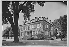The grounds were used by Patriot militia leaders Comte de Rochambeau, Marquis de Lafayette, and George Washington (the last of whom would become the first president of an independent United States).[67][64] The house itself was Washington's headquarters after his troops were defeated in the 1776 Battle of Long Island,[68] and Washington stayed at the house prior to the Battle of White Plains.[69] After Washington's troops were defeated in the Battle of White Plains, British General William Howe made the house his headquarters on November 13, 1776,[70][71] placing it behind British-held ground.[31][68] Hessian troops had pillaged the mansion before Howe's arrival, and various documents were as such scattered.[71] Royal Navy admiral Robert Digby occasionally invited the future British King William IV to the mansion during the war,[72][73] and Digby gifted Augustus Van Cortlandt a pair of wooden bird sculptures that had been taken from a Spanish privateer.[12][74] American troops unsuccessfully tried to retake the house in 1777.[75][76] A British captain surnamed Rowe was severely wounded in a battle nearby in 1780, and he died in the house just after his fiancée arrived,[77][78] giving rise to rumors that Rowe's ghost haunted the house.[7]