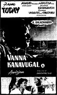 Vanna Kanavugal (transl. Colourful Dreams) is a 1987 Indian Tamil-language film directed by Ameerjan and produced by Kavithalayaa Productions. The film stars Karthik, Murali and Jayashree. It is a remake of the 1984 Malayalam film Adiyozhukkukal.[1][2] The film, which notably features no songs,[3] was released on 9 July 1987 and emerged a success.