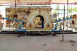 The sapthasthanam festival is conducted at Tiruvaiyaru during April every year. As per Hindu legend, it is the wedding festival of Nandikeswara, the sacred bull of Shiva on the Punarpoosa star during the Tamil month of Panguni.[8] The festival deity of Aiyarappar temple of Thiruvaiyaru is carried in a decorated glass palanquin along with the images of Nandikeswara and Suyasayambikai to the temples in Thirupazhanam, Thiruchottruthurai, Thiruvedhikudi, Thirukandiyur and Thirupoonthurthi. Each of the festival deities of the respective temples mounted in glass palanquins accompany Aiyarppar on the way to the final destiny, Thillaistanam. There is a grand display of fireworks in Cauvery riverbed outside Thillaistanam temple. The seven palanquins are carried to Aiyarappar temple in Thiruvaiyyaru. Hundreds of people witness the convergence of seven glass palanquins carrying principal deities of respective temples from seven places at Tiruvaiyaru. The devotees perform Poochorithal(flower festival) in which a doll offers flowers to the principal deities in the palanquins. After the Poochorithal, the palanquins leave for their respective temples.[9][10]
