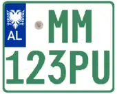Agricultural vehicle registration plates in Albania have white borders and white texts on a green background. They follow the format [AA MB 00], where MB stands for Makinë Bujqësore which means Agricultural Vehicle.