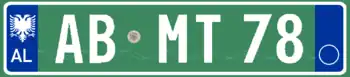 A new format similar to the post-1994 Italian and post-2009 French plate designs has been introduced since 16 February 2011.[1] The plates start with a blue strip at the left with 'AL' and redesigned double-headed eagle in white, 2 serial letters, security hologram, 3 digits, 2 serial letters on a rectangular white background, and end on the right with a blue strip that's supposed to show year of registration and regional code in white on. It has been observed that the last two identification elements are de facto not included while the font is more emphasized than the post-2002 one.[2] Plates of all vehicles would experience a similar change.[3] Critics claim that the color of the double headed eagle and strip is not representative of red and black colors of the Albanian flag.