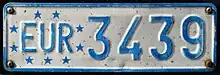 Staff of the institutions of the European Union located in Belgium could previously request a specialized number plate.[2] These plates were blue and displayed the letters "EUR" in a circle of yellow stars on the left hand side. These plates gradually became less popular than the "international" plates as the owner ran the risk of vandalism, since many Belgians erroneously believed that the car owner was not subject to Belgian car tax. From 2011 to mid-2015 these plates were replaced by a different format of a leading digit followed by three letters and three digits, with the leading digit "8" as identifier (8-AAA-111). The so-called 8-plates are no longer issued and staff of international organizations such as NATO, European Union, EuroControl, etc. are, since 2014, issued a standard Belgian plate. Those plates with the 8-LLL-NNN structure will, however, remain assigned until they expire.