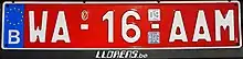 Effective 1 May 2016, the Belgian temporary plate has changed. The Euro-style plate has a blue band on the left, featuring a European circle of stars symbol and the letter B. The characters are stamped and coloured white on a red background, as previously, following a ZA - ## - AAA pattern. The first character is either a X for vehicles intended for export within 30 days, or W for temporarily registered vehicles. The two middle digits are the last two of a calendar year (for example, "16". for 2016). A three-letter indication of the month when the plate becomes effective appears below the second separator. Plates are issued in pairs for all vehicles (one front, one rear), except for motorcylcles, mopeds and trailers.[4]