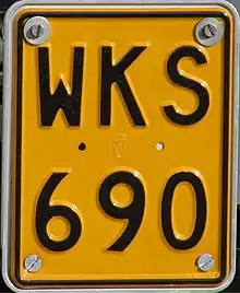 Plates for motorcycles with an engine capacity of more than 50 cc issued before November 2010 have black letters on a yellow background and begin with the letters "M" or "W". These plates have a square design, with the three letters on the first row and the three numbers on the second. The newer European plates were red on white like standard vehicle plates and begin with 1-MAA-001. With the introduction of license plates for (P-AAA-111) and <45 km/h mopeds (S-AAA-111) in 2018, motorcycles got their own design again starting with M: (M-AAA-111) Motorcycles with an engine capacity of less than 50 cc carry no license plates.