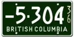 1936 | Embossed white serial on green plate with border line; "BRITISH COLUMBIA" at bottom and vertical "36" at right | none | 12-345 | 1 to approximately 89-000 | |