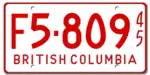 1945 | Embossed red serial on white plate with border line; "BRITISH COLUMBIA" at bottom and vertical "45" at right | none | 12-345 | 1 to 99-999 | |