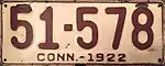 - ↑ Wasielewski, Joe. "Illustrated History of Connecticut License Plates – Passenger 1920–1929". Retrieved August 10, 2023.